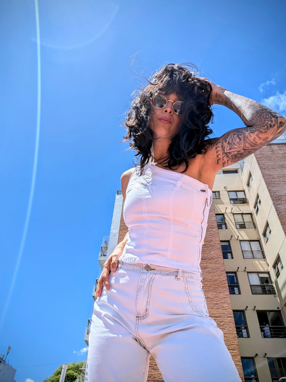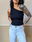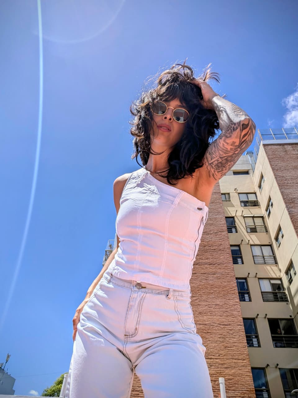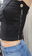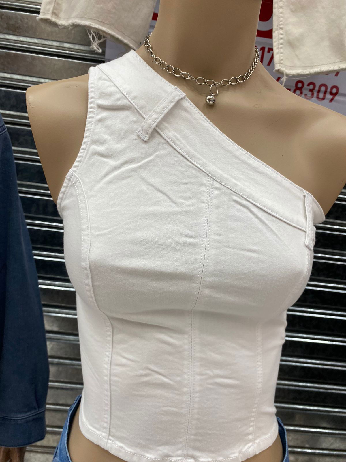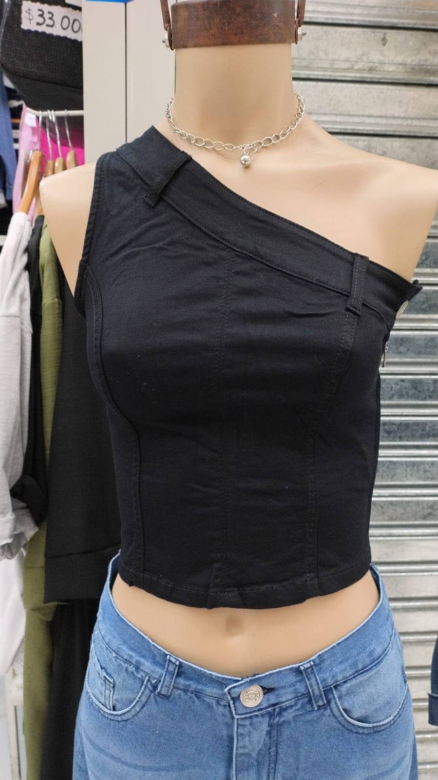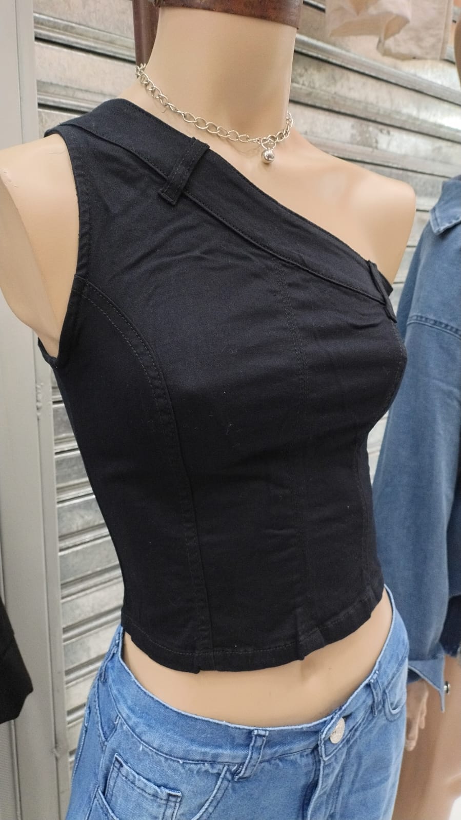 Top de jean de un hombro, con cierre y botón. Colores: blanco y negro